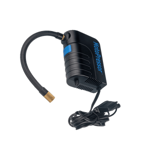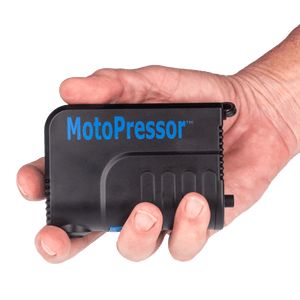 The MotoPressor MiniPUMP, is a 12V plug-in tyre inflator.  This pump is small, measuring 90x35x81mm and the whole kit weighs just 503g.  It will pump between 3 and 130PSI and will inflate a 150/70 R18 tyre or a 90/90 R21 tyre in under 5:30.  You can set and save 3 pre-set pressures (A, B & C), and the pump will automatically shut OFF once the pre-set pressure is reached. The kit includes, an inflation hose, battery lead and Alligator clips with an SAE connector, a zippered EVA storage case and operating instructions.
