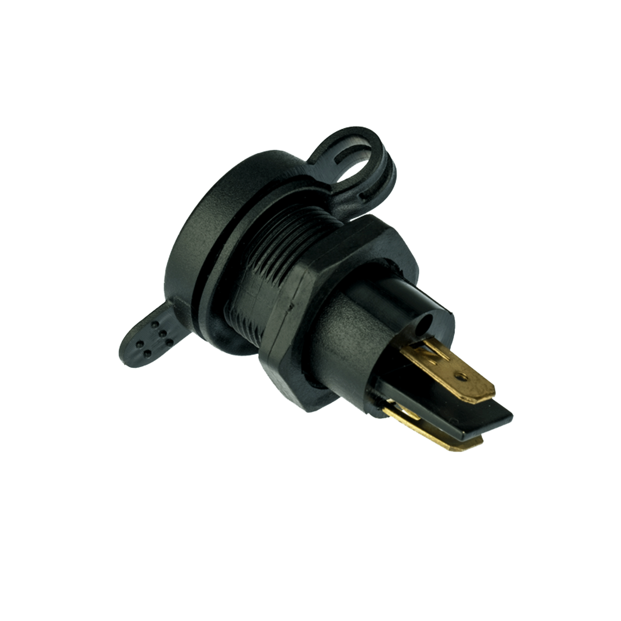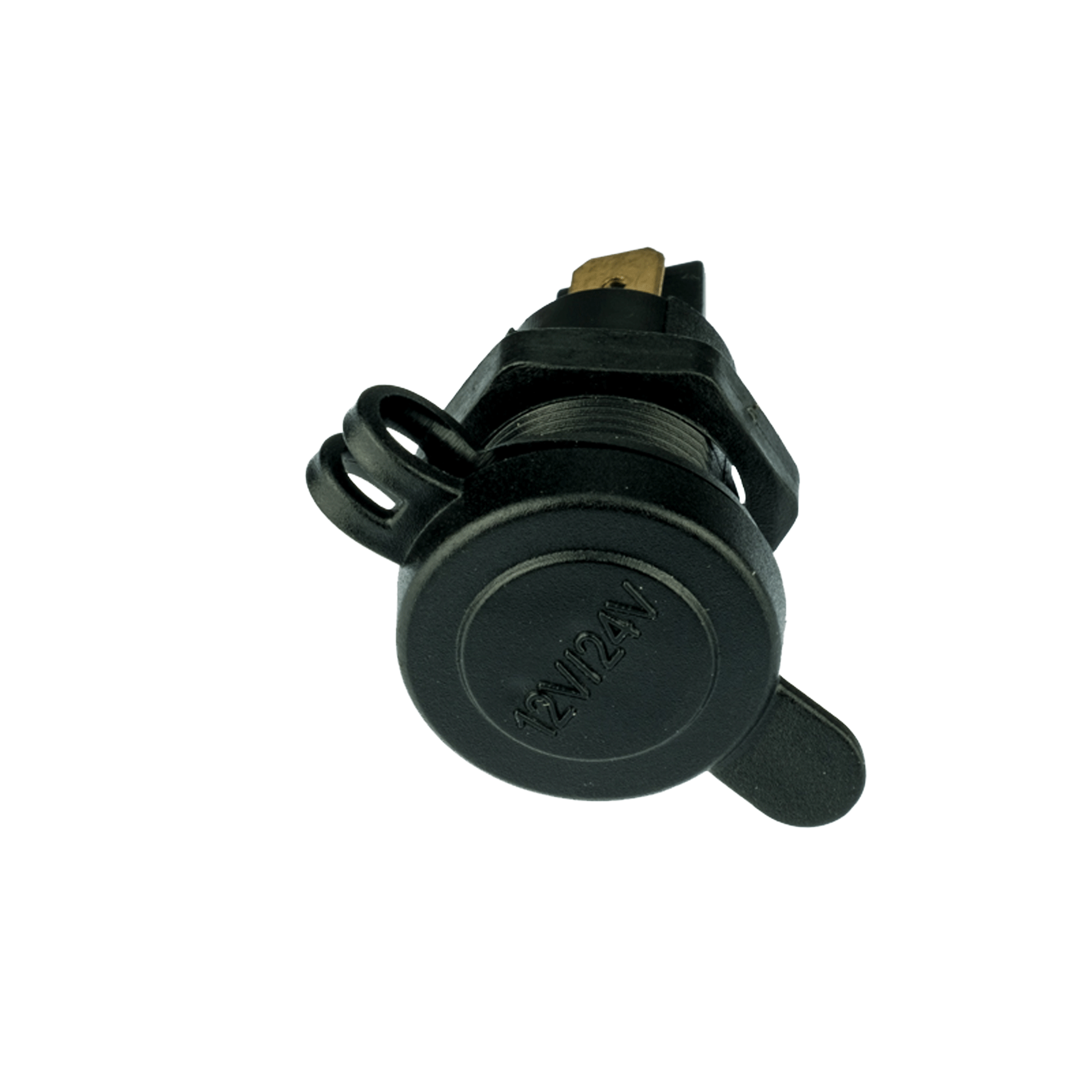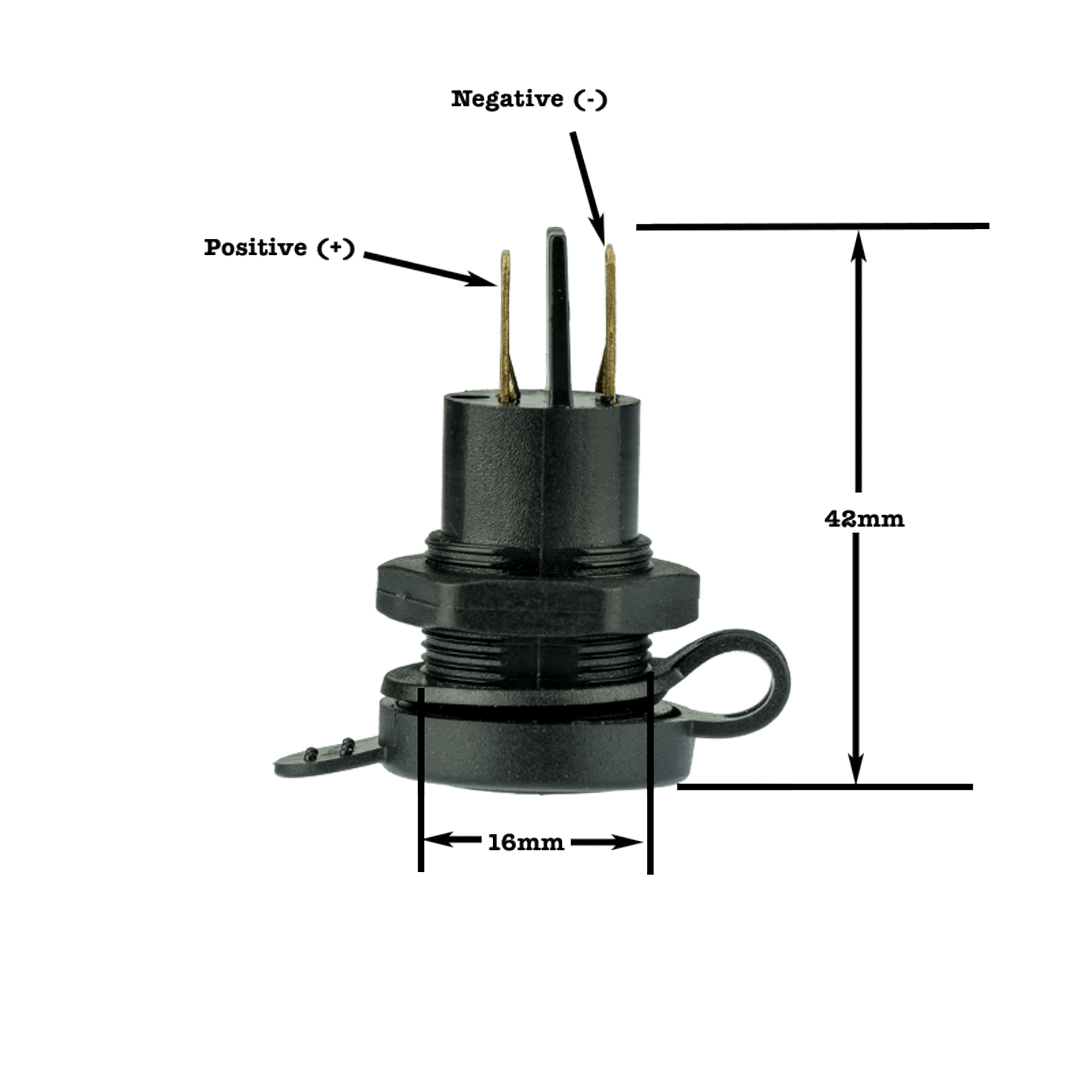 Comes with a 1.5m long power lead with Battery Circles and Blade Connectors. To install, attach the power lead to your battery, Red to (+) and Black to (-). Next attach the Red wire (+) to the pin closest to the centre of the socket and the Black wire (-) to the pin closest to the edge of the socket (see picture). The socket will handle 12V/120W.