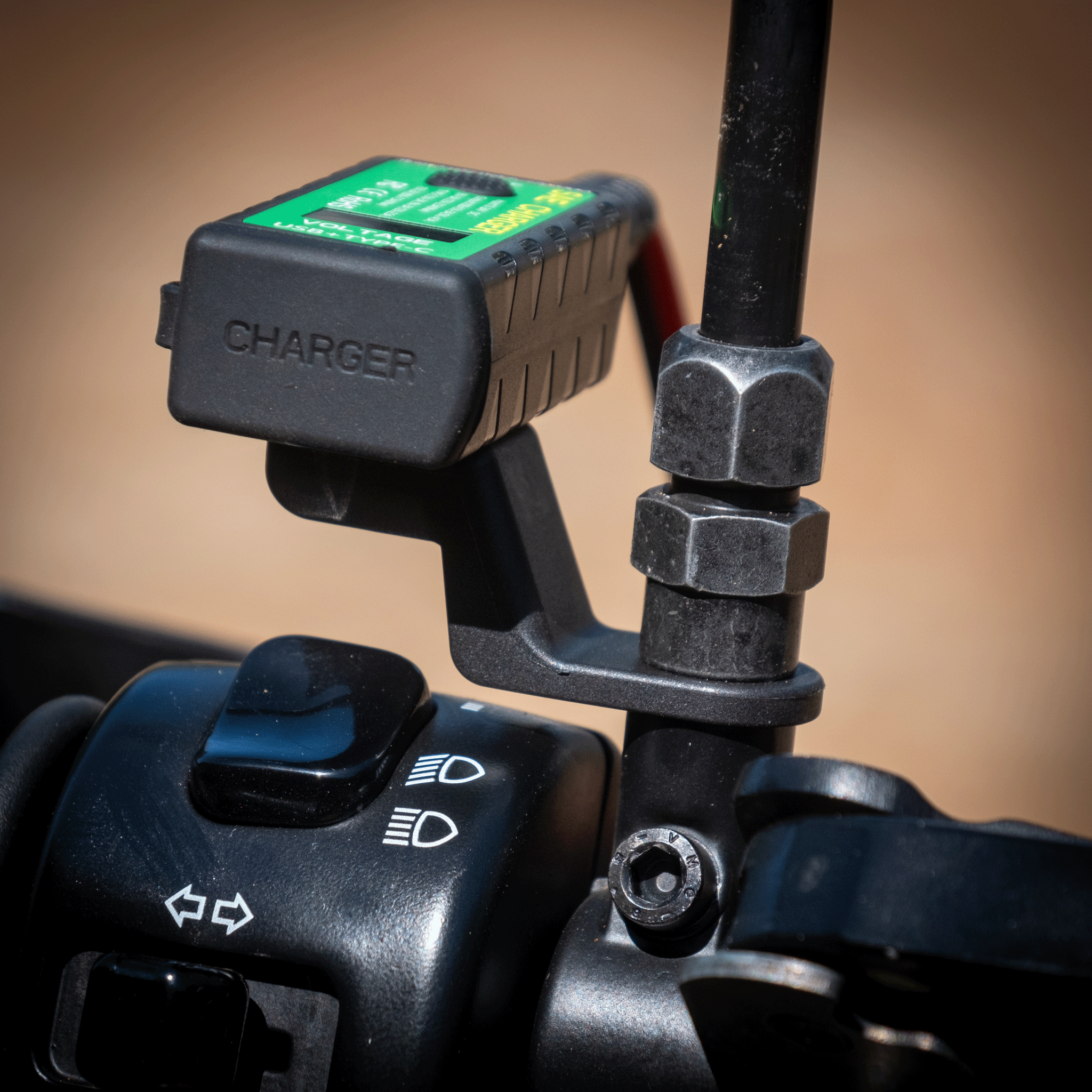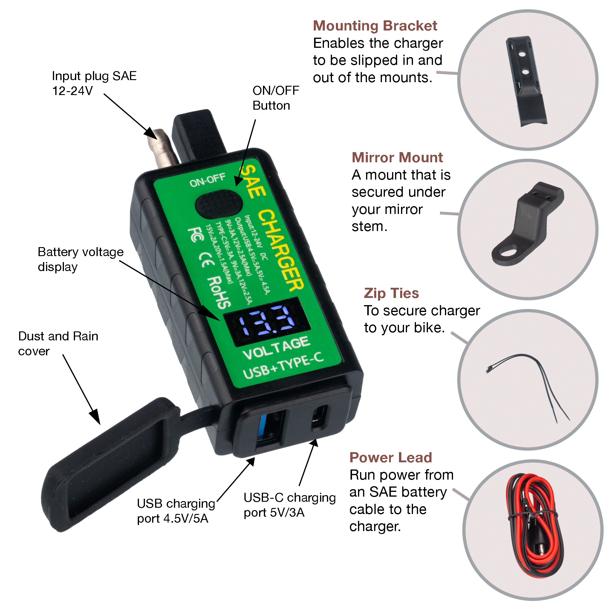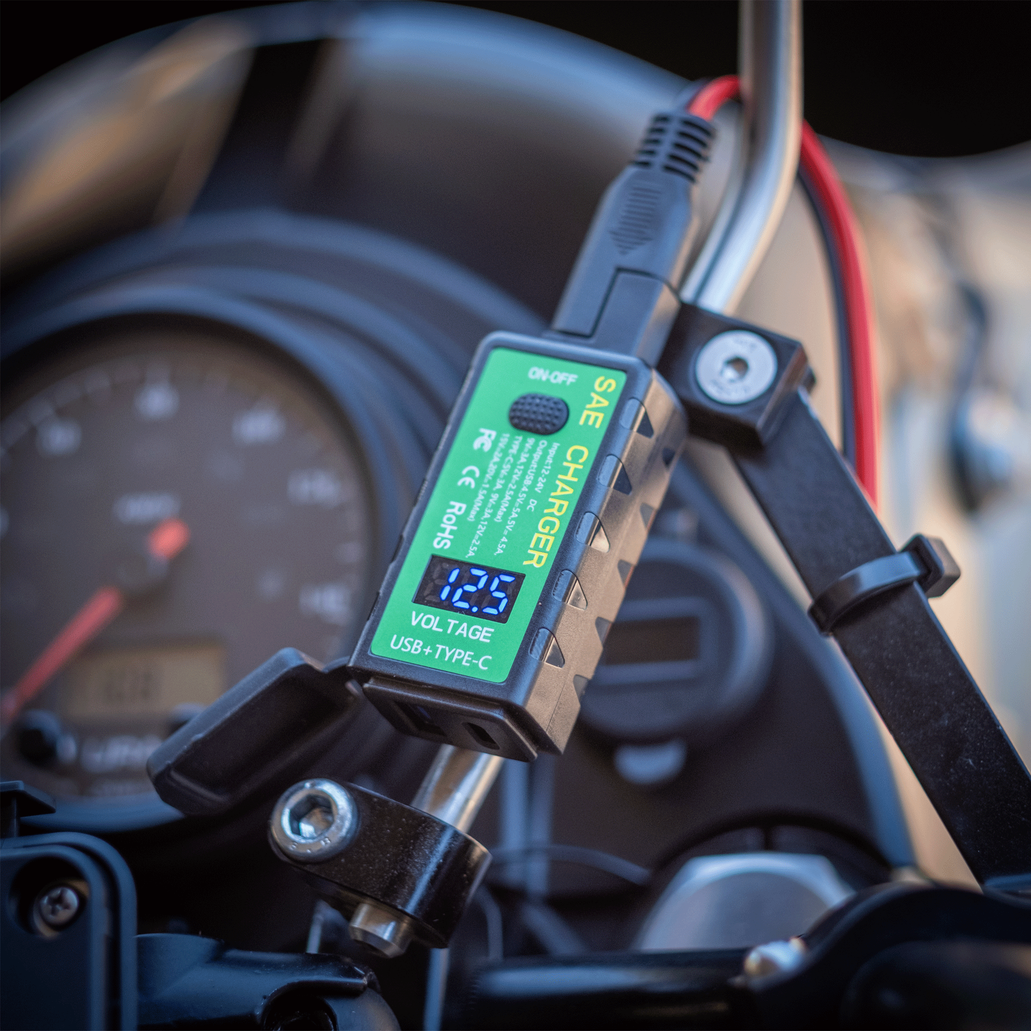 Hook the charger up to your battery and you have a USB or Type C charging AND a voltmeter. The unit has an ON/OFF switch so when you’re not riding, turn the unit OFF and you won’t drain your battery. Comes with a 1m long SAE to SAE lead, a mirror mount and a couple of zip ties to secure the unit to your bike. When the adapter is plugged in and powered ON, it will display the voltage of your battery. To remove the unit from your bike, simply unplug and slip it from the mount.
