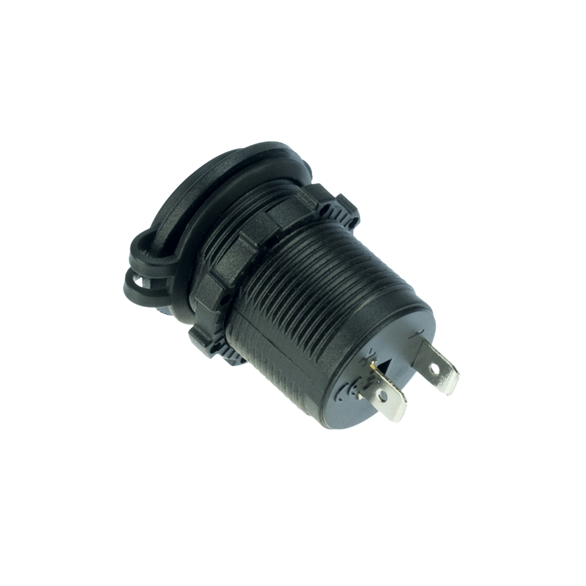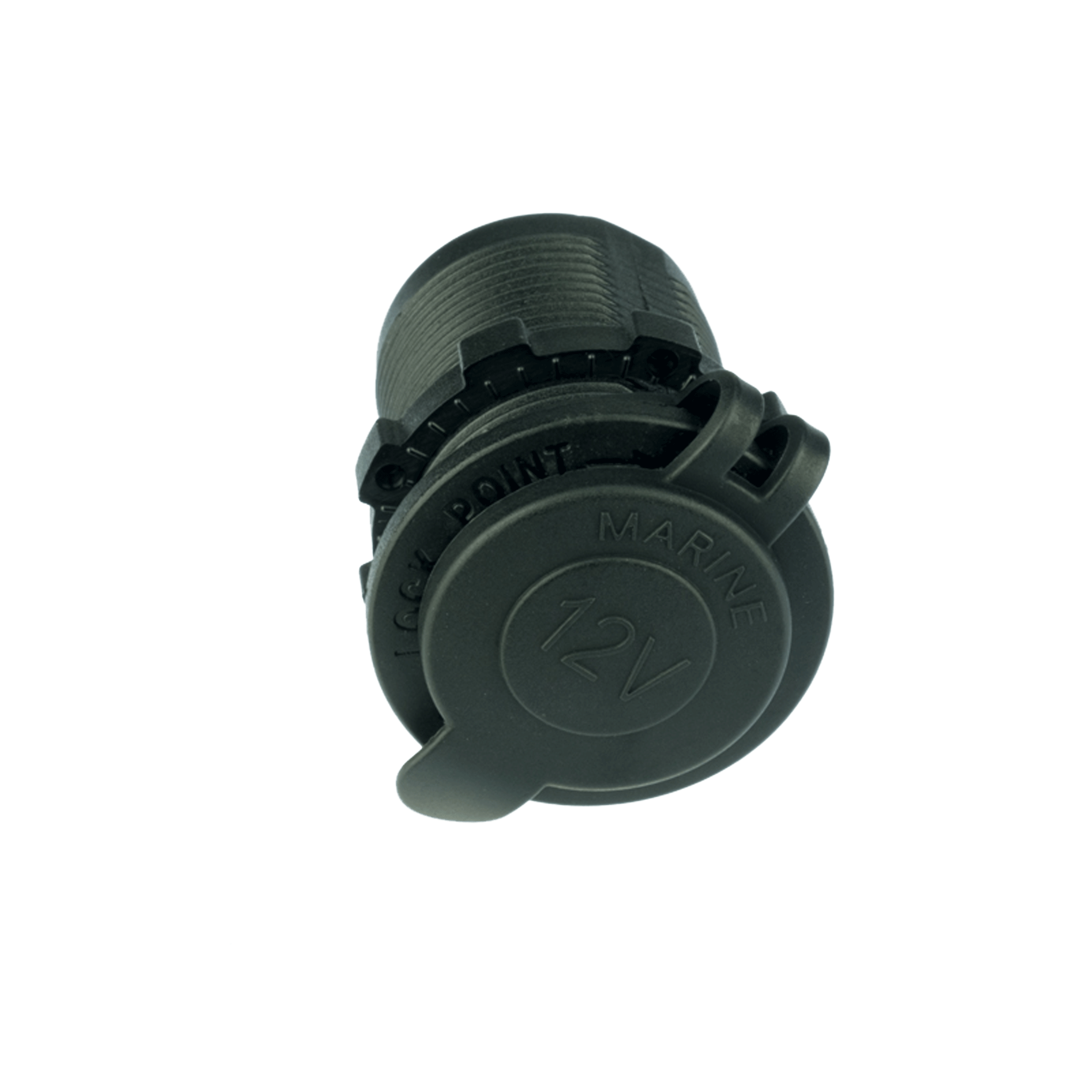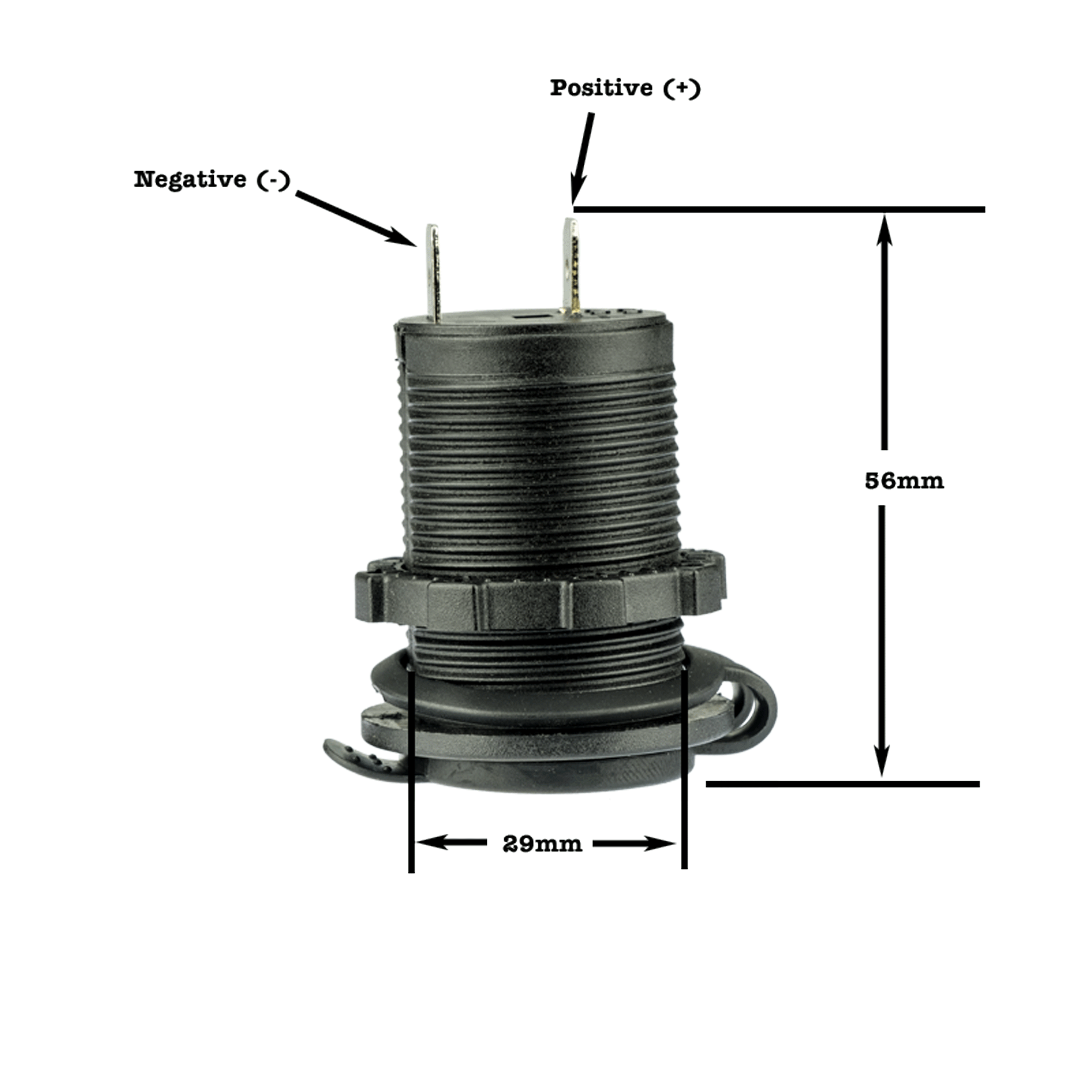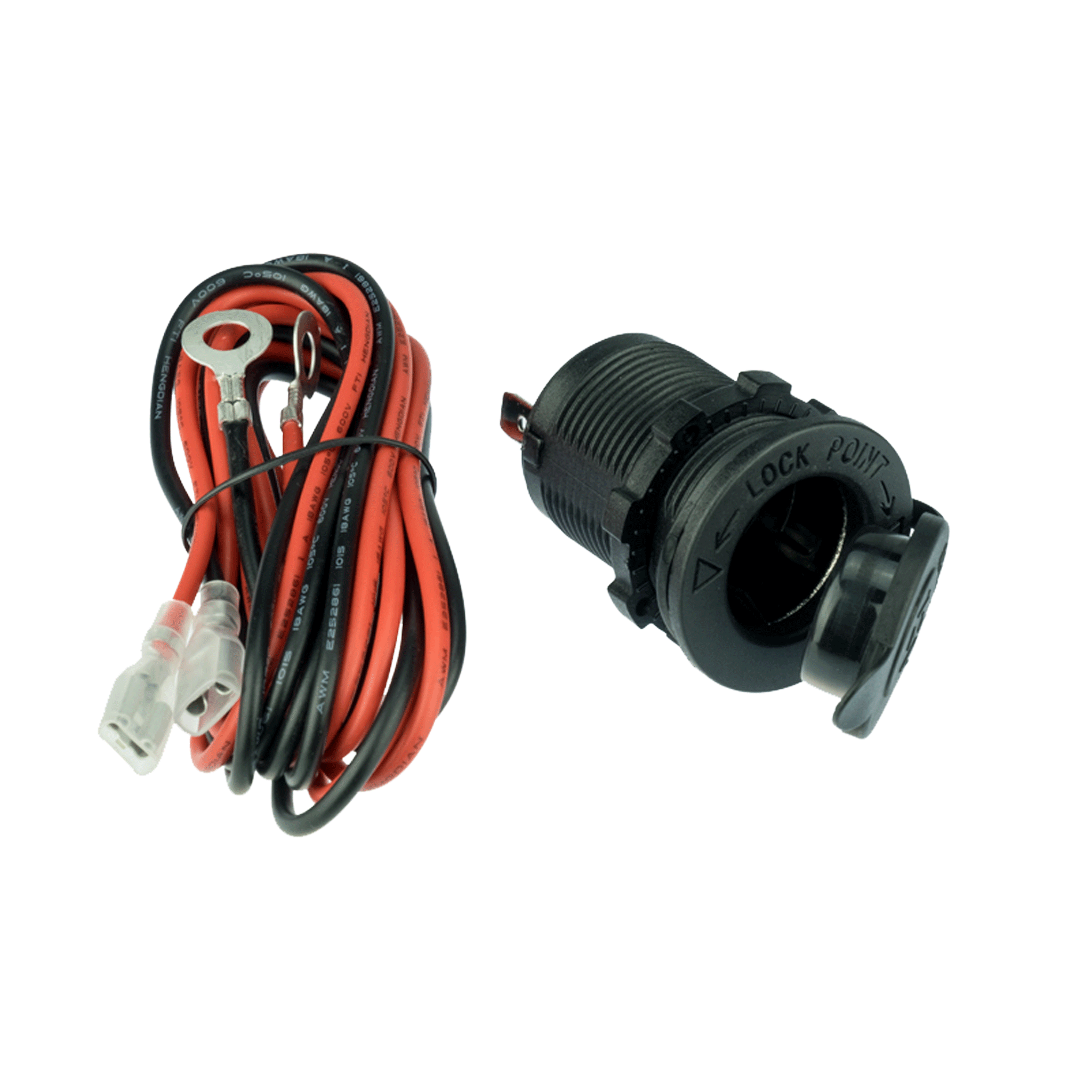 Comes with a 1.5m long power lead with Battery Circles and Blade Connectors. Attach the power lead to your battery, Red to (+) and Black to (-). Next attach the corresponding wires to the back of the socket as marked on the back of the socket. The socket will handle 12V/120W.