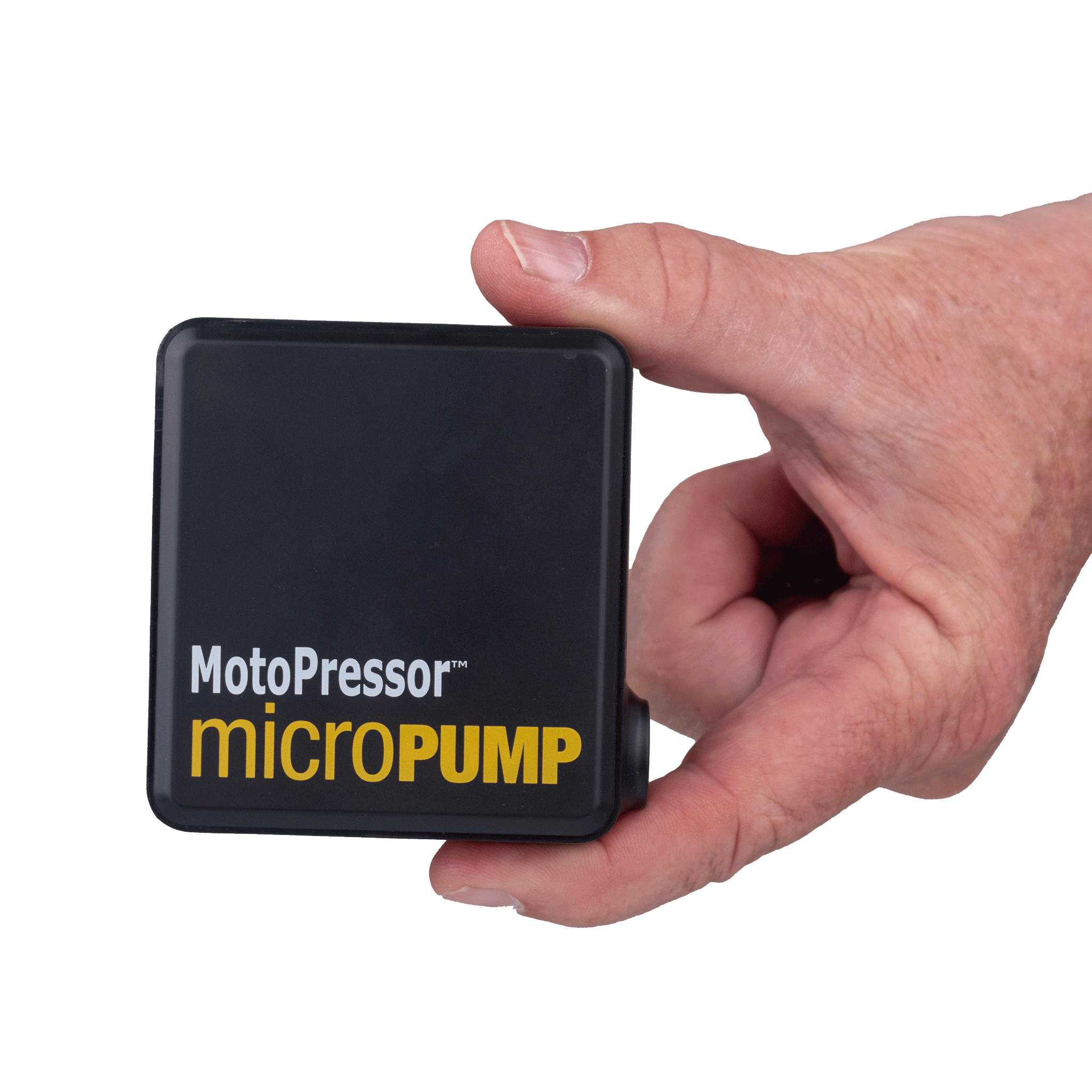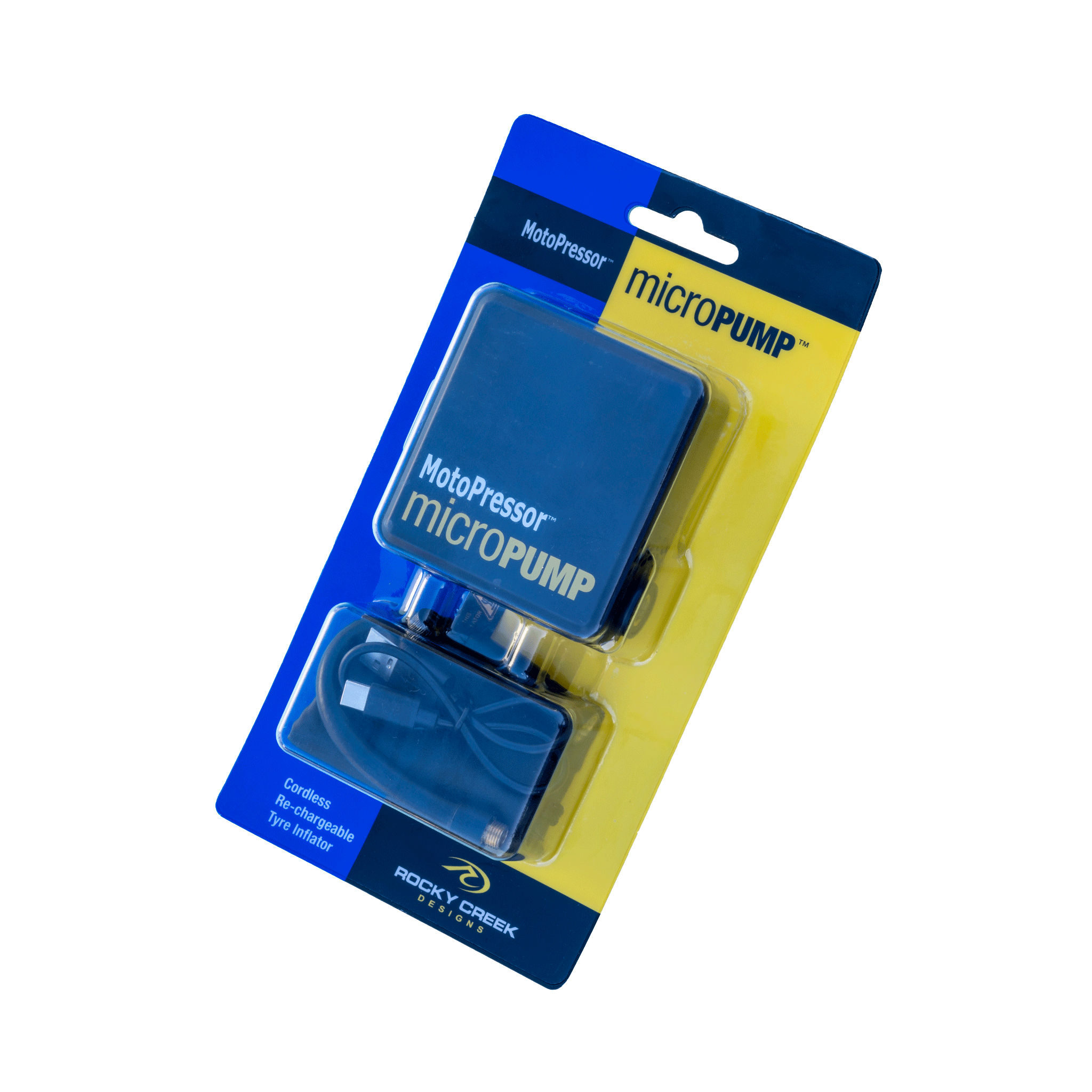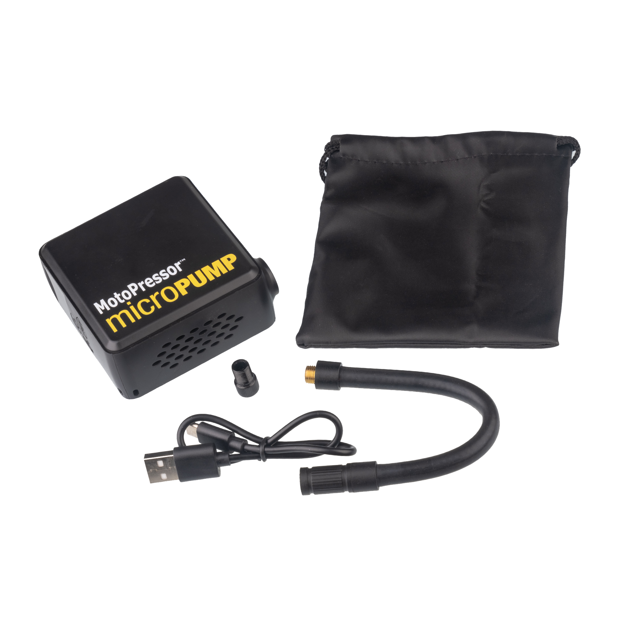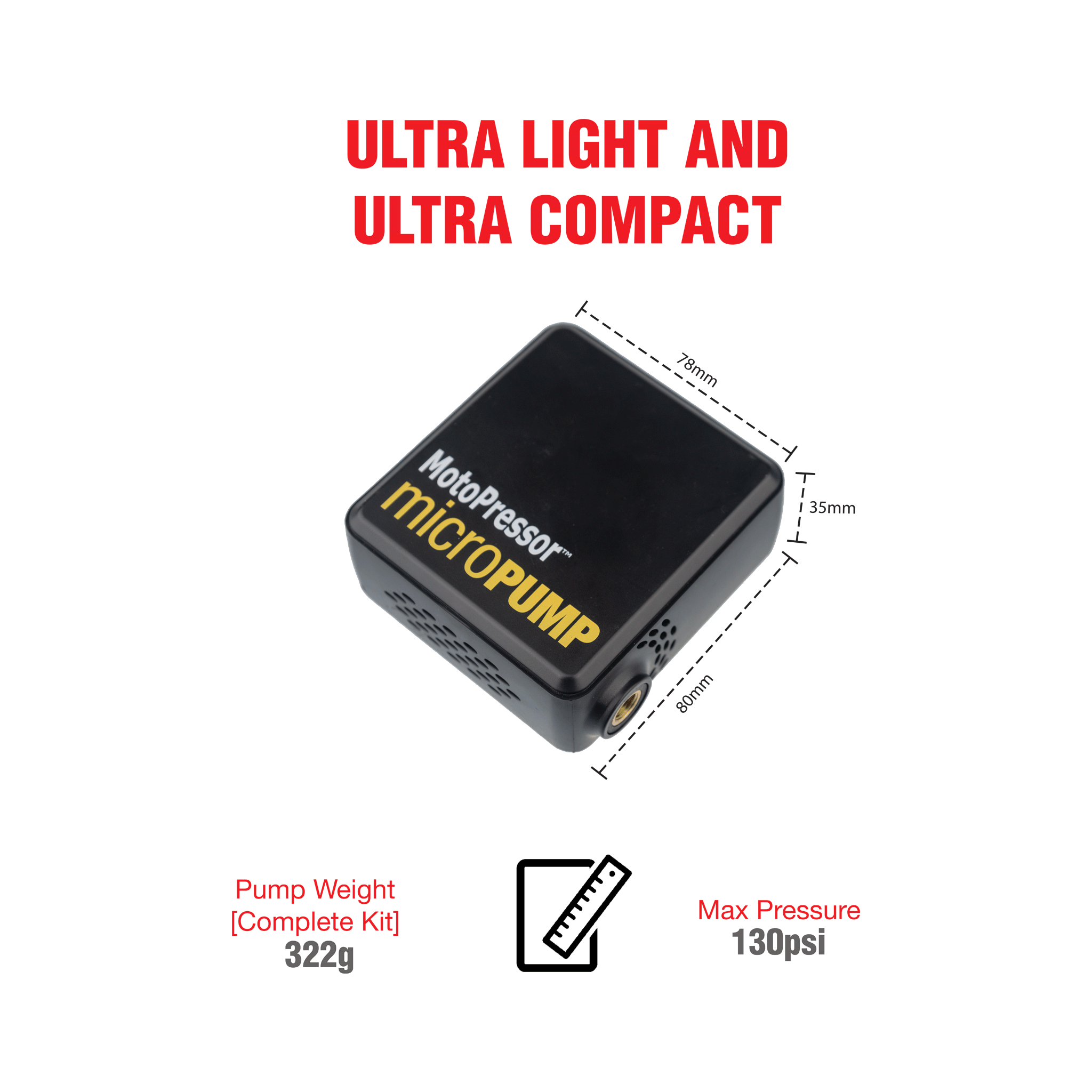 The MotoPressor MicroPUMP, is a cordless rechargeable tyre inflator. This pump is tiny, measuring 78x35x80mm and the whole kit weighs just 322g. It will pump to 130PSI and will inflate a 150/70 R18 tyre TWICE (0-36psi) and a 90/90 R21 tyre ONCE (0-27psi) on the single charge. You can set and save 3 pre-set pressures (A, B & C), and the pump will automatically shut OFF once the pre-set pressure is reached. Recharge from most USB adapters in 1-3 hours, depending on battery condition. The kit includes, an inflation hose, USB C charging cable, Presta valve adapter, storage bag and operating instructions.