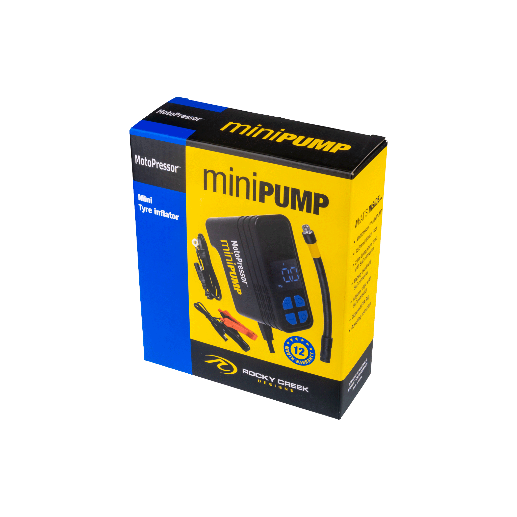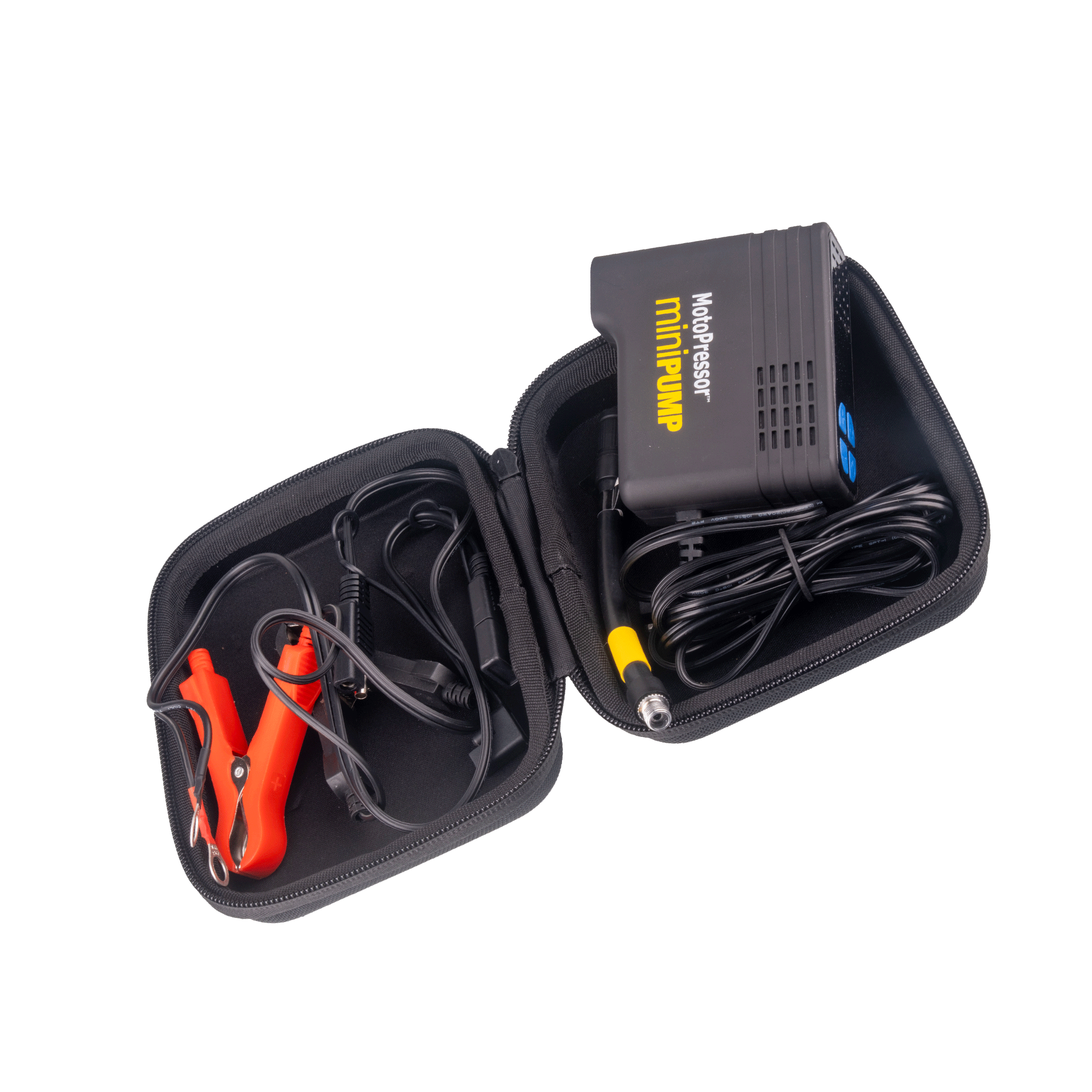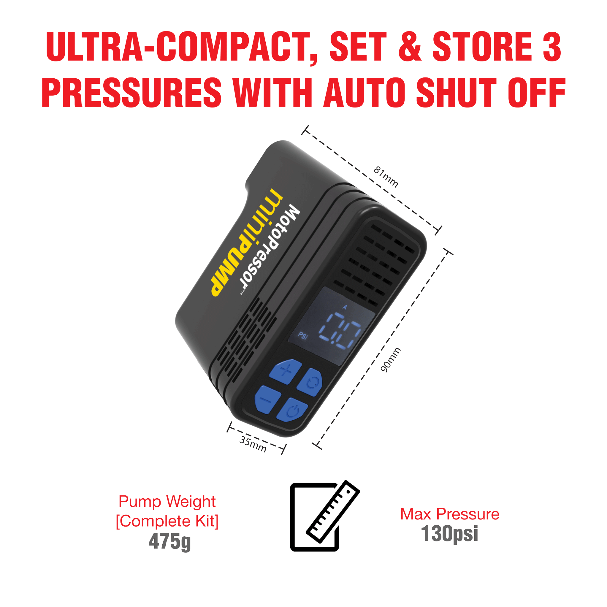 The MotoPressor MiniPUMP, is a 12V plug-in tyre inflator. This pump is small, measuring 90x35x81mm and the whole kit weighs just 475g. It will pump between 3 and 130PSI and will inflate a 150/70 R18 tyre or a 90/90 R21 tyre in under 5:30. You can set and save 3 pre-set pressures (A, B & C), and the pump will automatically shut OFF once the pre-set pressure is reached. The kit includes, an inflation hose, battery lead and Alligator clips with an SAE connector, a zippered EVA storage case and operating instructions.