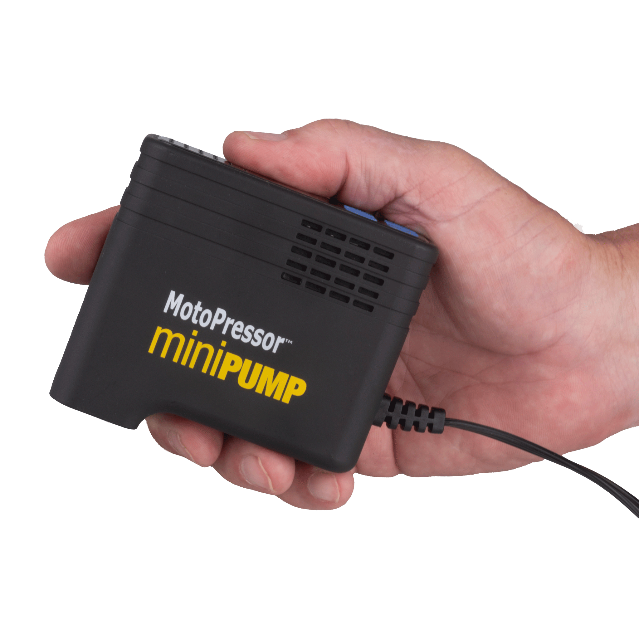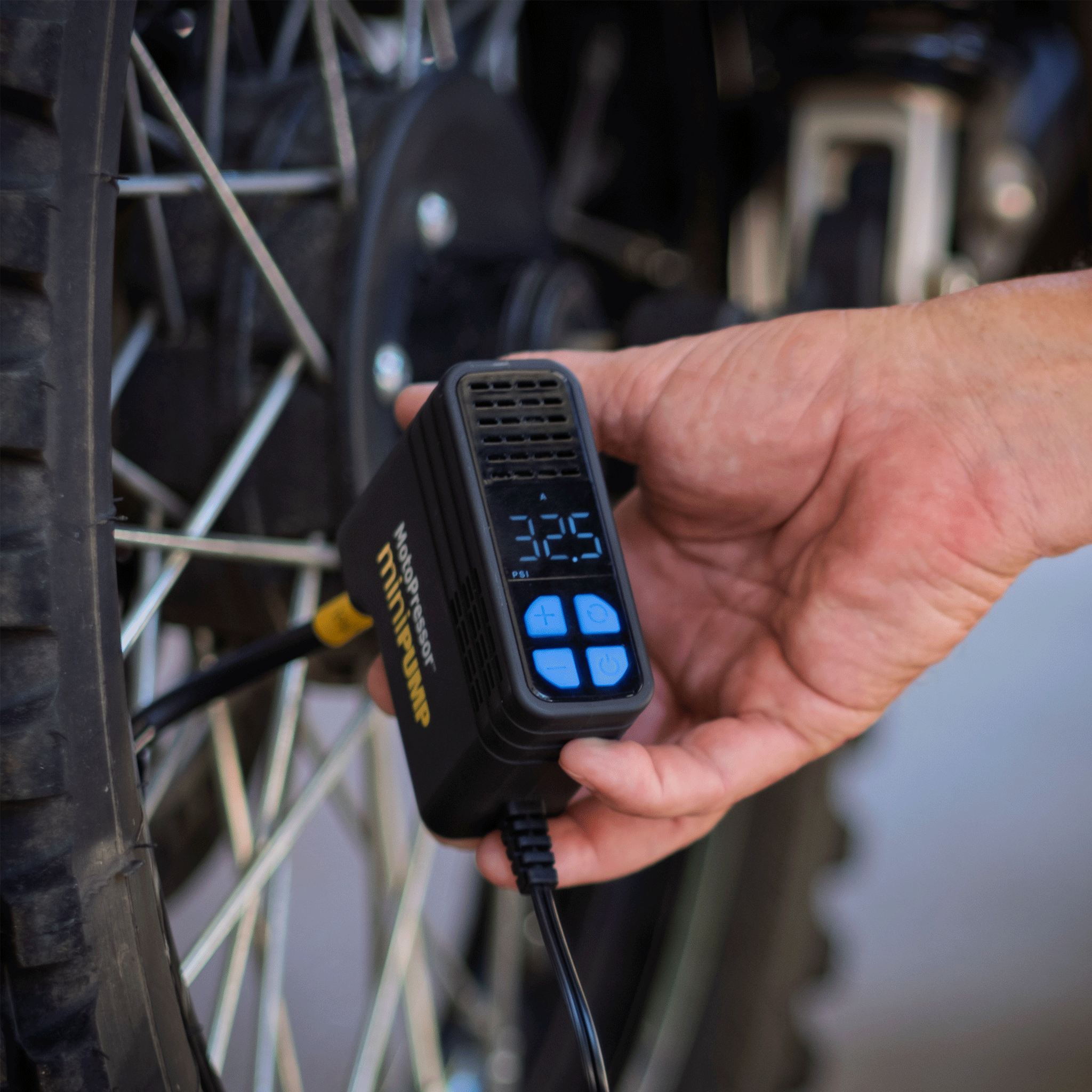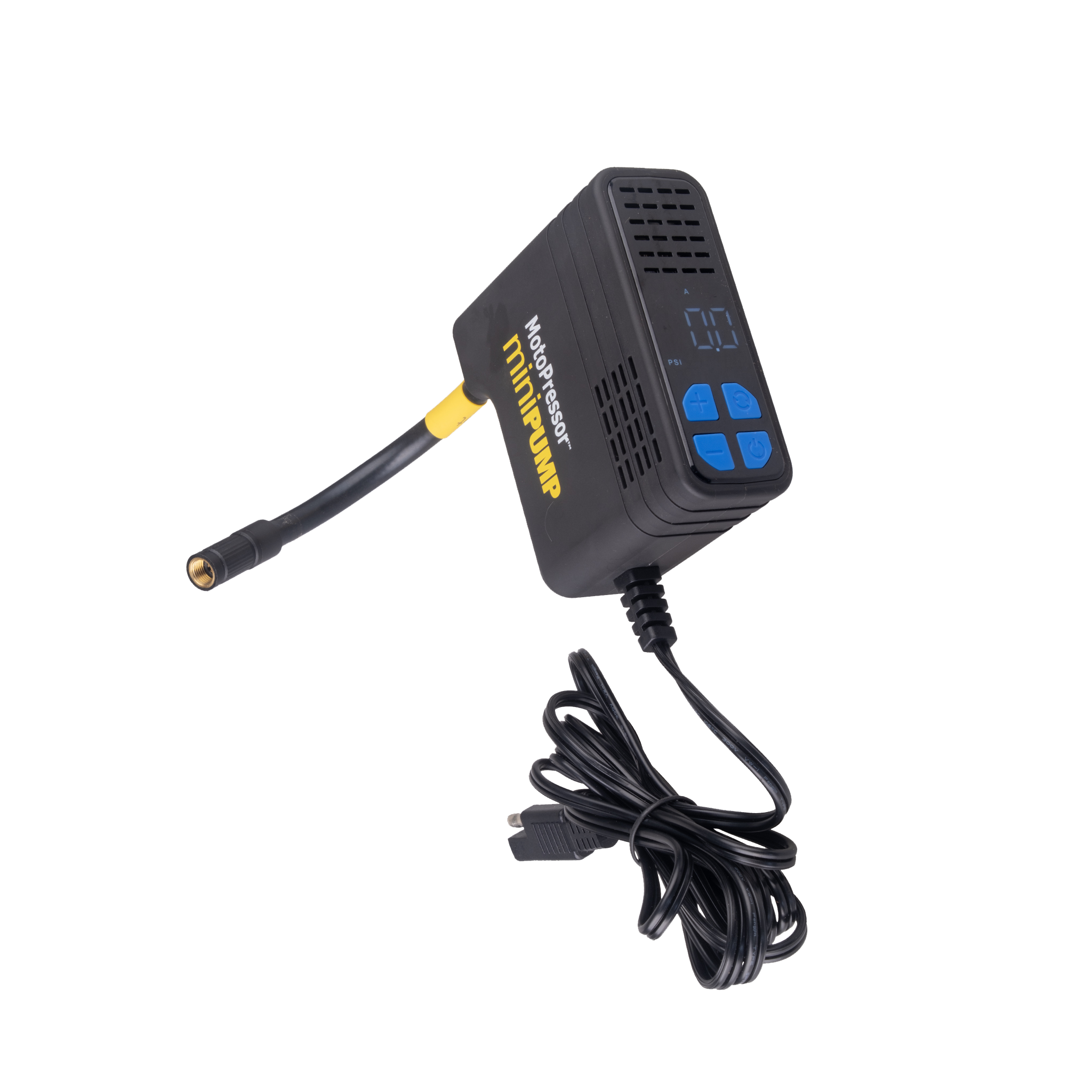 The MotoPressor MiniPUMP, is a 12V plug-in tyre inflator. This pump is small, measuring 90x35x81mm and the whole kit weighs just 475g. It will pump between 3 and 130PSI and will inflate a 150/70 R18 tyre or a 90/90 R21 tyre in under 5:30. You can set and save 3 pre-set pressures (A, B & C), and the pump will automatically shut OFF once the pre-set pressure is reached. The kit includes, an inflation hose, battery lead and Alligator clips with an SAE connector, a zippered EVA storage case and operating instructions.