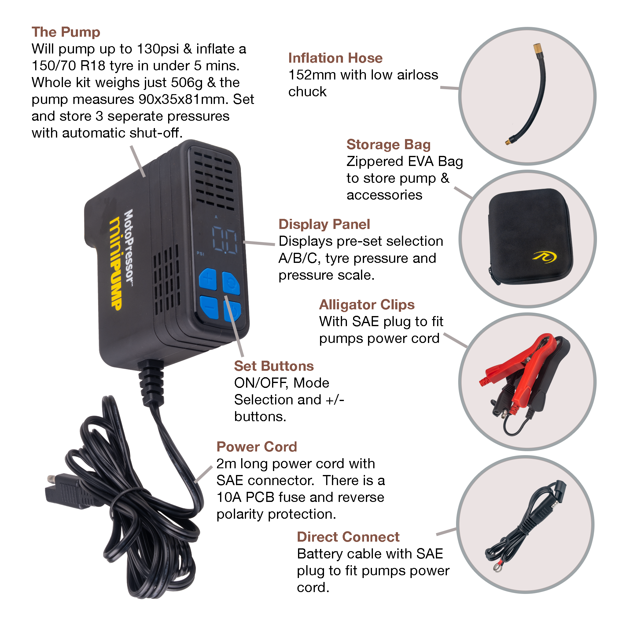 Like all MotoPressor products, the MiniPUMP is built to last. Designed for real-world riding, it’s compact, rugged, and dependable — a must-have tool for any adventure rider’s kit.