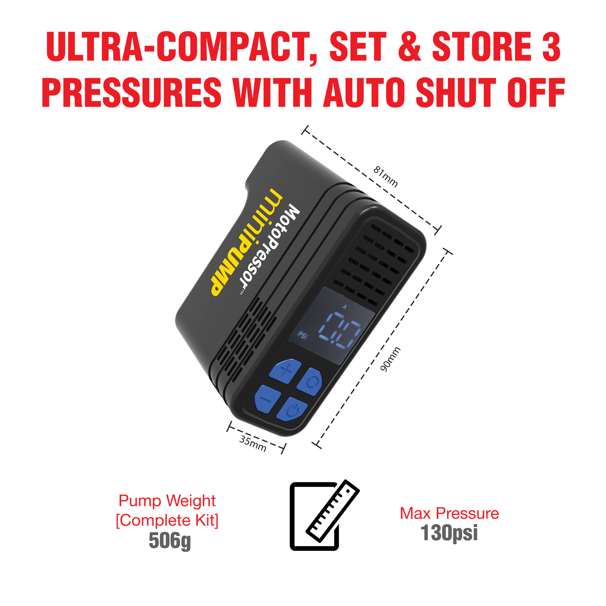 MotoPressor MiniPUMP, the ultimate 12V plug-in tyre inflator for motorcycles, ATVs, and adventure riders. Compact, reliable, and powerful — it’s designed to keep you moving, wherever the road or trail leads.